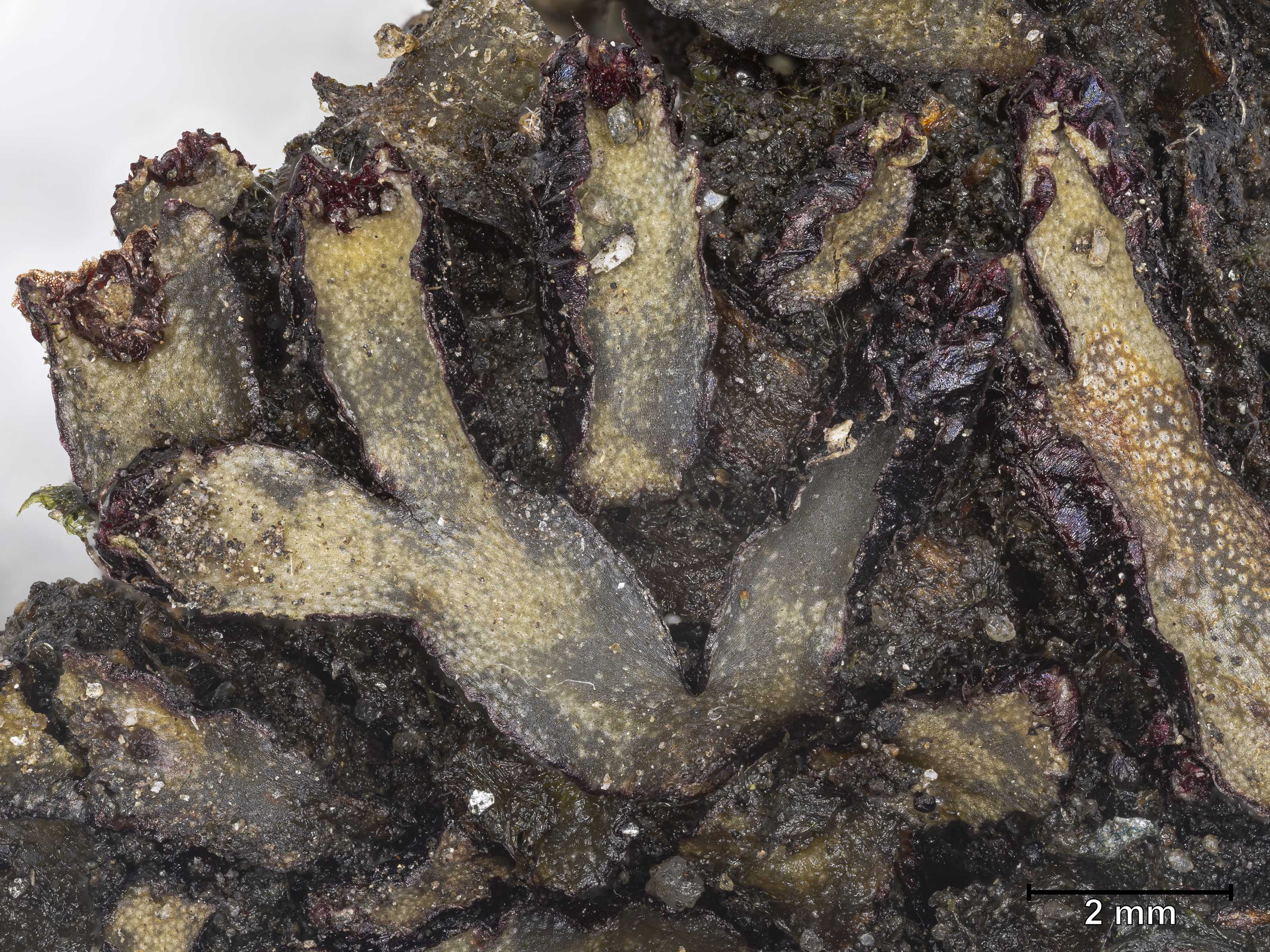 ![]() Targionia hypophylla Habitus (Aufsicht) | ![]() Targionia hypophylla Habitus (Ansicht von Oberseite) | ![]() Targionia hypophylla Habitus (Ansicht von Unterseite) |