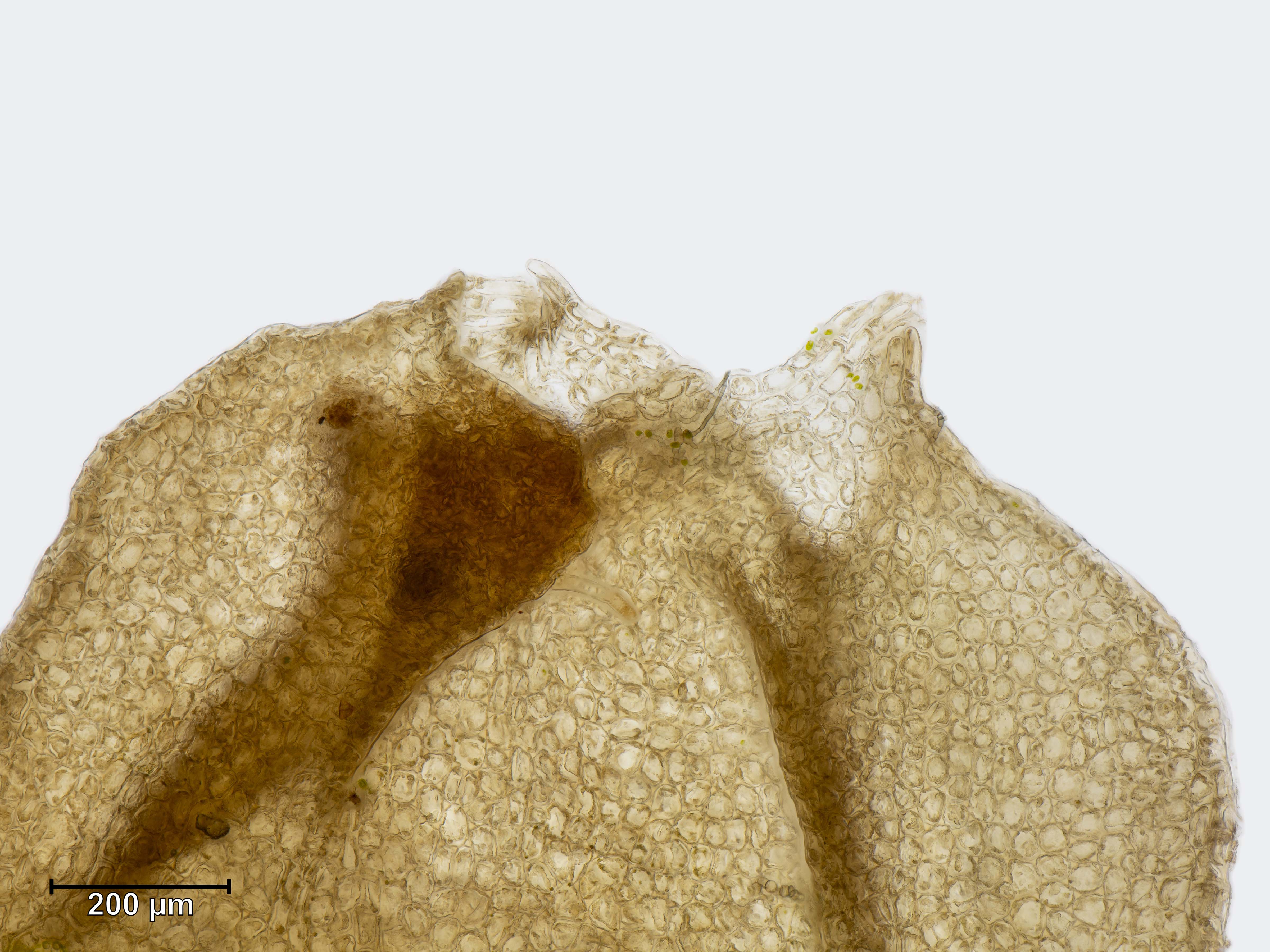![]() Solenostoma sphaerocarpum Flankenblatt Blattspitze |